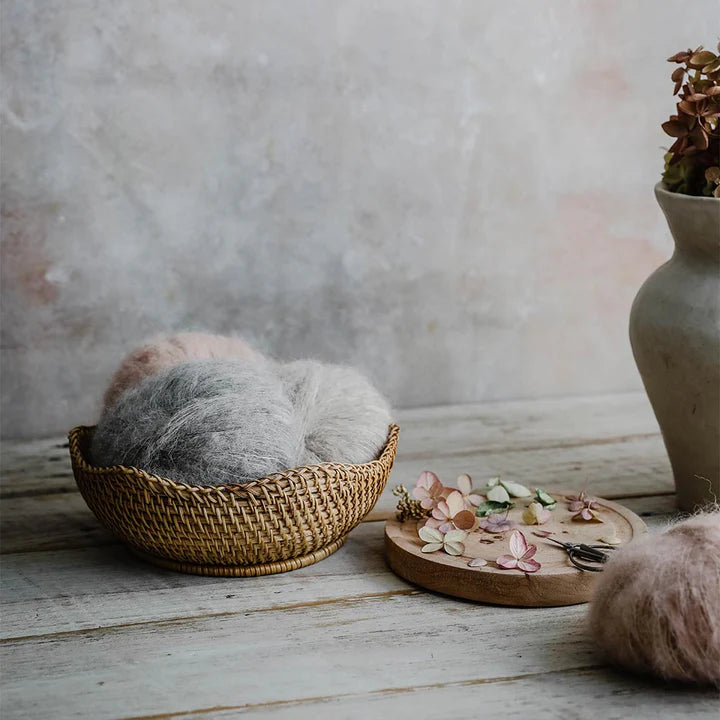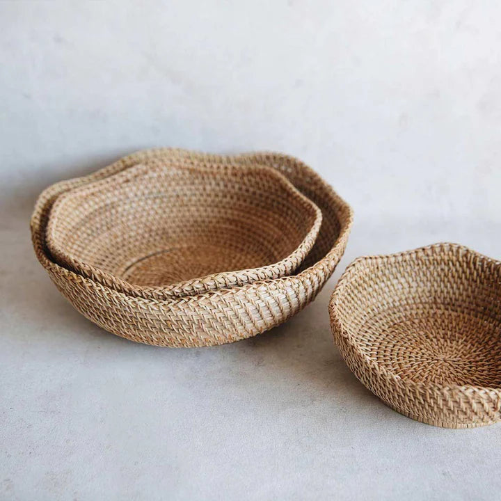 Handmade with love, these charming woven rattan baskets are sturdy and functional. They offer dimension, texture, and easy storage in any space.